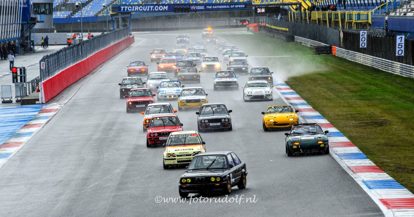 De herfst is begonnen! Het was afgelopen weekend moeilijk voor te stellen dat we eerder dit jaar in opblaaszwembadjes in de paddock lagen om af te koelen… Het begon al met een natte quali, 32 auto’s op de baan, glibberen en glijden. Yannick Rehorst moest drie rondetijden inleveren wegens Track Limits, maar zette ondertussen wel de snelste tijd met zijn Mazda, een halve seconde sneller dan Pieter Bikker in de BMW E30. Derde snelste was de man die er een traditie van maakt om de Finaleraces op Assen mee te pakken, Ruben de Bruijn in zijn Vauxhall Astra. Zij waren de uitblinkers op de gladde baan, met Shirley van der Lof op p. 4 als “best of the rest”. Dat was om 10 uur op zaterdagochtend en drie en een half uur later was het tijd voor Race 1, met Yannick die de leiding nam, op de voet gevolgd door Pieter en Ruben. Yannick zette ook de snelste ronde van de wedstrijd, maar toch was het Pieter die hem in de achtste ronde voorbij wist te steken. Op de finishlijn zat er minder dan een seconde tussen de eerste drie! Nadat ze de snel gestarte Sven-Olaf Homann in zijn Mazda had weten te passeren zat Shirley van der Lof veilig op p. 4, ruim voor Erik de Boer en haar vader, Alexander.